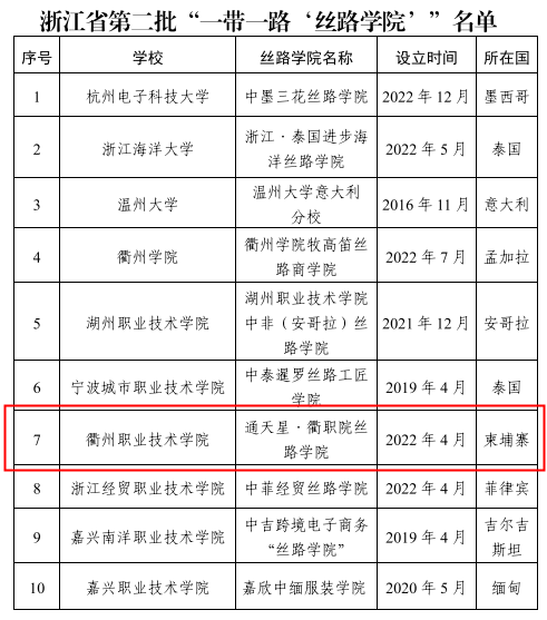 近日,浙江省教育厅、浙江省商务厅公布了10所第二批“一带一路‘丝路学院’”名单,我校通天星·衢职院“丝路学院”成功入选。