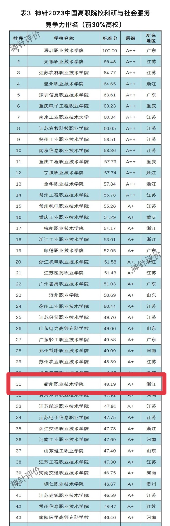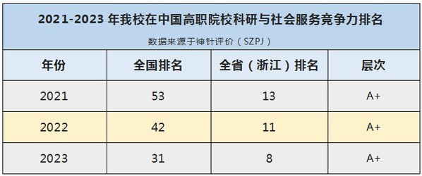 人才培养、科学研究、社会服务是现代大学的主要职能。近日,神针评价(SZPJ)就全国高职院校的科研与社会服务竞争力发展态势(2023)进行科学评价,根据报告中公布的“2023中国高职院校科研与社会服务竞争力排名榜单”显示,我校位居全国第31位,浙江省第8位,处A+层级。