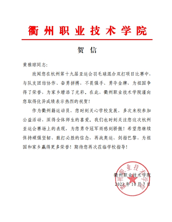 “雅思”组合夺冠消息传来,衢职关注亚运、关注羽毛球比赛的师生无一不欢呼、骄傲。令人激动的是,就在夺冠当晚,卫冕冠军黄雅琼给我校师生发来了回信。
