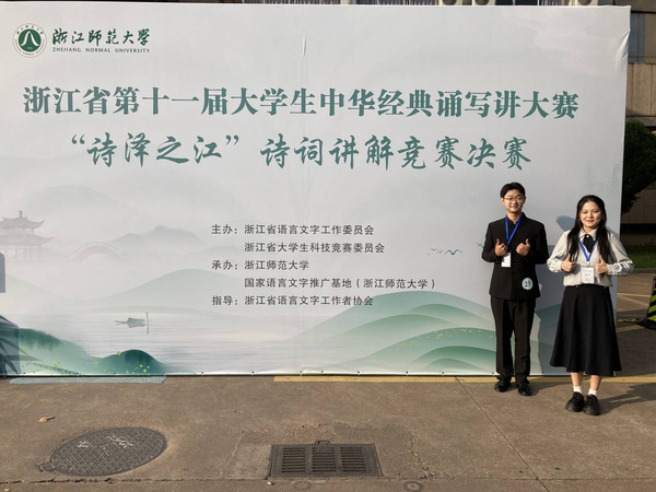 10月28日至29日,浙江省第十一届大学生中华经典诵写讲大赛“诗泽之江”诗词讲解竞赛决赛在浙江师范大学举行,来自全省49所高校的125位优秀学子入围此次竞赛决赛。我校喜获高职组一等奖2项、三等奖4项,其中经济管理学院21金融专业朱志成(陈锦娟、龚慧兰指导)、经济管理学院22应用英语专业金瑜慧(龚慧兰、陈锦娟指导)分别获得一等奖,袁锦贵、龚慧兰、马超老师指导的参赛队员方嘉男、华琨、陈伟杰、戴懿获4项三等奖,无论是一等奖获得数量还是奖项总数都处于全省高职组第一方阵,我校也因此获得本次比赛的优秀组织奖,陈锦娟、龚慧兰老师获得优秀指导老师荣誉。