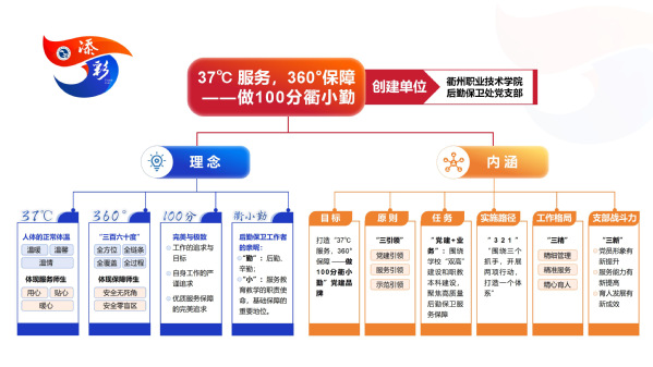 近日,浙江省教育后勤基建协会公布浙江省高校后勤首届党建品牌建设优秀案例名单,在首批26个优秀案例中,我校后勤保卫处“37℃ 服务,360°保障 ——做100分衢小勤”党建品牌成功入选,全省仅5个高职院校入选。我校作为唯一的高职院校代表,在省教育后勤基建协会思专会上作经验交流分享。