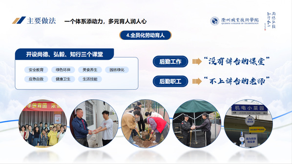 三、一个体系添动力,多元育人润人心。坚持党建、服务、保卫、育人齐抓共建、有机融合,积极践行育人使命,打造全方面管理育人、全程化服务育人、全方位环境育人、全员化劳动育人的多元育人体系。