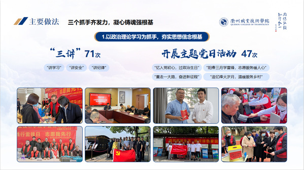 近年来,后勤保卫处党支部以打造“37℃ 服务,360°保障 ——做100分衢小勤”党建品牌为目标,坚持党建引领、服务引领和示范引领,围绕学校创“双高”和职教本科建设目标任务,聚焦高质量后勤保卫服务保障,按照“党建+业务”理念,通过“围绕三个抓手,开展两项行动,打造一个体系”的“321”实施路径,构建起“精细管理、精准服务、精心育人”的“三精”工作格局,不断提升支部“党员形象有新提升、服务能力有新提高、育人发展有新成效”的“三新”战斗力。