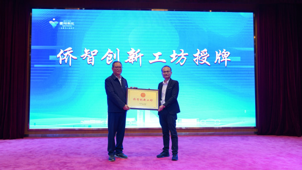 郑航为我校“侨智创新工坊”授牌,孔庆红接牌。