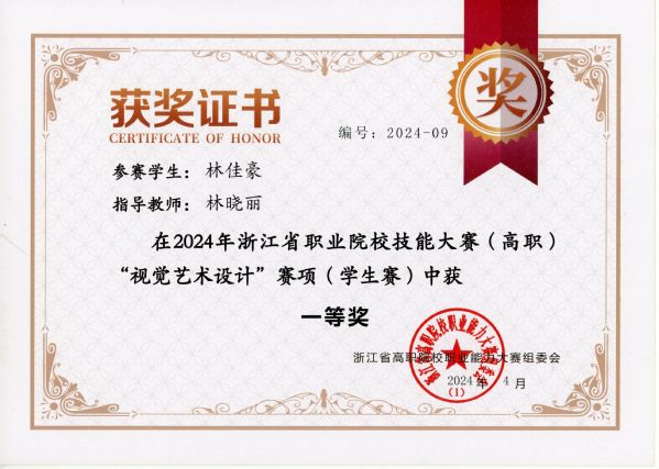 “视觉艺术设计”赛项,22设计2班林佳豪荣获一等奖(指导老师:林晓丽);22设计1班沈烨荣获一等奖(指导老师:任海燕);22设计1班郭叶萌荣获二等奖(指导老师:许金友)。