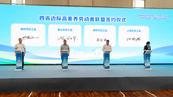 衢州市总工会党组书记、常务副主席徐文,黄山市总工会党组书记、副主席冯学祥,南平市总工会党组书记、常务副主席朱金生,上饶市总工会党组副书记、常务副主席陈晓春签订四省边际高素养劳动者联盟协议。