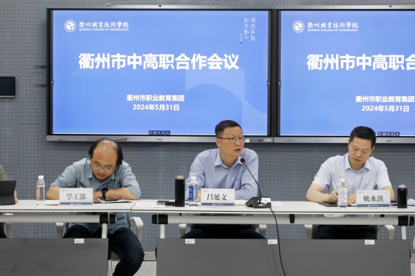 为进一步深化中高职一体化人才培养模式,提高中高职一体化人才培养质量,打造高素养技术技能人才队伍,助力衢州市职业教育高质量发展,5月31日,衢州市职业教育集团在我校召开中高职合作会议。衢州市职业教育集团理事长、校党委副书记、校长吕延文出席,学工部、教务处、人事处和各教学单位负责人,衢州市各中职学校分管校领导、相关部门负责人、合作专业负责人参加,会议由党委委员、副校长姚水洪主持。