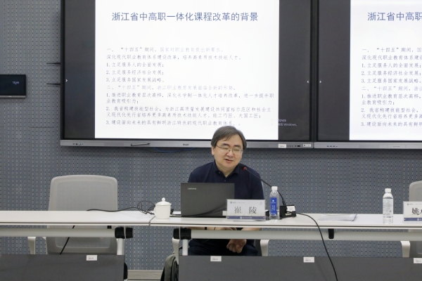 会议的第二阶段,浙江省教育厅职成教教研室主任、省教科院职成教所所长崔陵作《浙江省中高职一体化课程改革的逻辑与实现》专题报告。