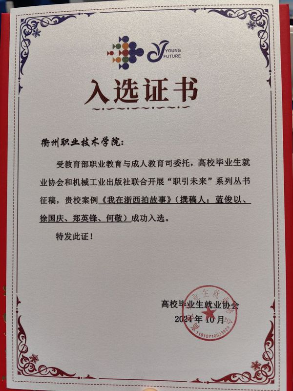 据悉,《职引未来》丛书征稿活动由教育部职业教育与成人教育司委托高校毕业生就业协会和机械工业出版社联合开展,活动得到了全国高职院校的高度重视和积极申报。经院校申报、编辑出版部门推荐、专家评审等程序,我校案例《我在浙西拍故事》从全国四百七十篇候选文章中脱颖而出,历经三轮修订,并最终确认为首批入选的九十七个案例之一。《职引未来》丛书计划于2025年上半年由机械工业出版社正式出版。