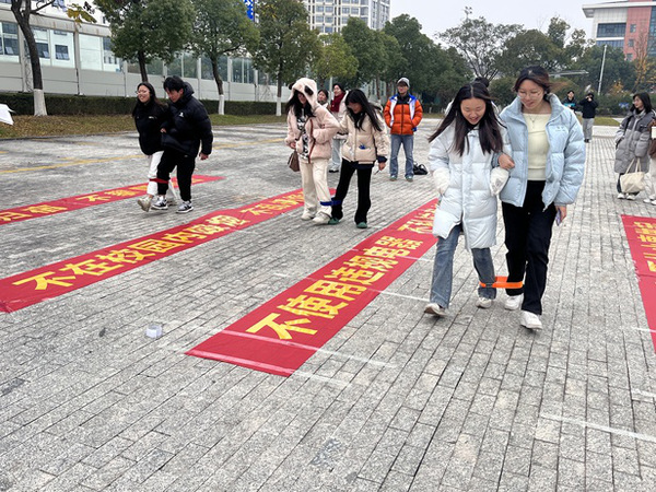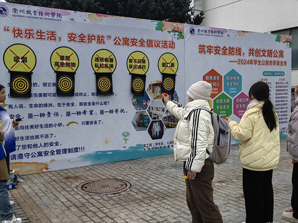 活动包含两人三足安全接力、隐患消除飞镖投掷、安全常识探险之旅、违规电器识别挑战赛等趣味游戏,吸引了众多师生的热情参与。两人三足安全接力赛中,参与者两人一组绑腿穿过写着“安全并不容易,要从小事做起”“不使用大功率电器、不私拉乱接”“不在校园内吸烟、不乱扔烟头”“归宿、不攀爬阳台的横幅,表示大家一起努力创建平安公寓。隐患消除飞镖投掷赛中,参与者向“违规电器”脏乱差”“攀爬”“吸烟”“夜不归宿”等内容的靶盘扔飞镖,表明师生坚决抵制公寓不文明行为的决心。安全常识探险之旅中,参与者需要通过一系列的关卡,学习并掌握公寓生活中常见的安全常识。这些关卡涵盖了消防安全、用电安全、食品安全等多个方面,旨在帮助大家提升安全意识,提高自我保护能力。而识别违规电器游戏则通过展示各种常见的违规电器,让参与者了解哪些电器是禁止在公寓内使用的,以及使用这些电器可能带来的安全隐患。参与者在这些寓教于乐的游戏中,不仅能够在轻松愉快的氛围中轻松掌握安全知识,还能深刻体会到安全问题的重要性,进一步加深对安全规范的理解和认同。
