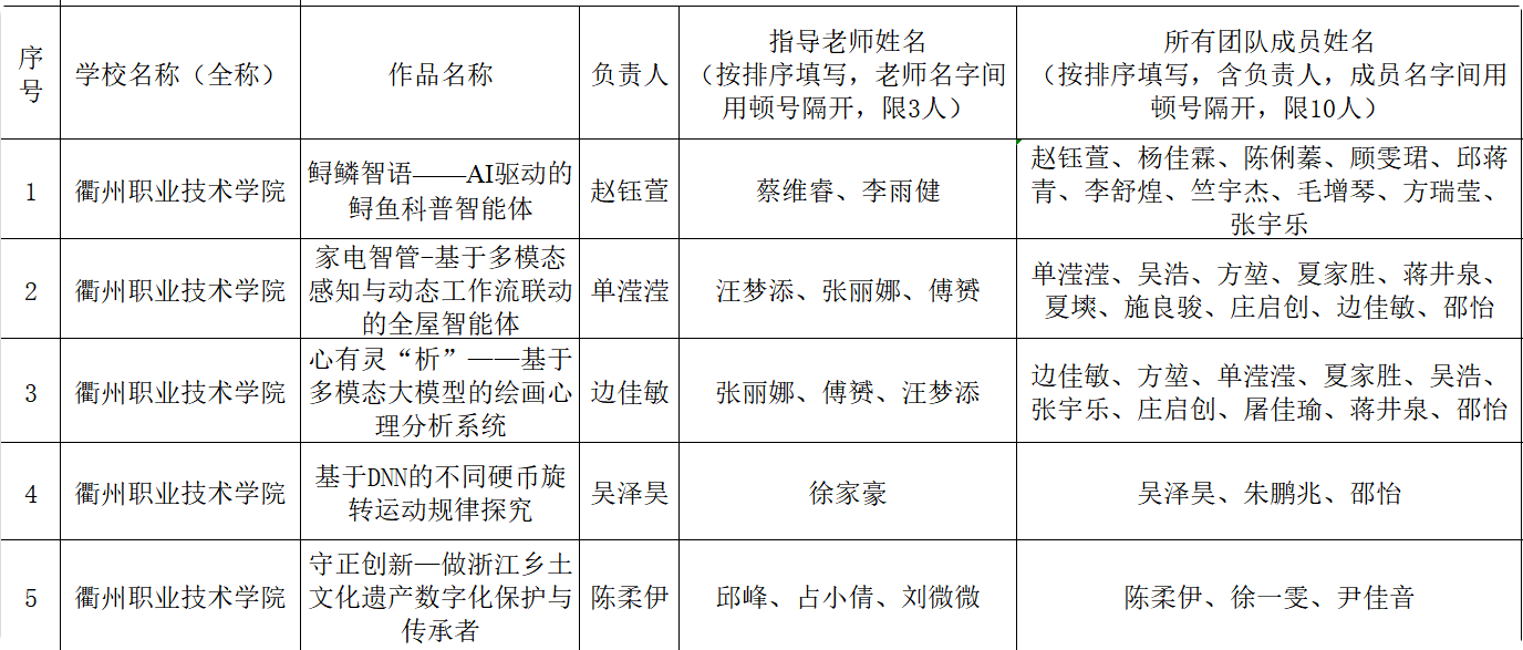 根据浙江省第十九届“挑战杯”大学生课外学术科技作品竞赛“人工智能+”专项赛工作要求,我校组织开展了“人工智能+”专项赛作品申报工作,经各二级学院组织申报,现将拟推荐省赛作品进行公示。公示时间2025年7月11日-7月15日,共5天,联系电话:8068095,13575666559,13505707877。